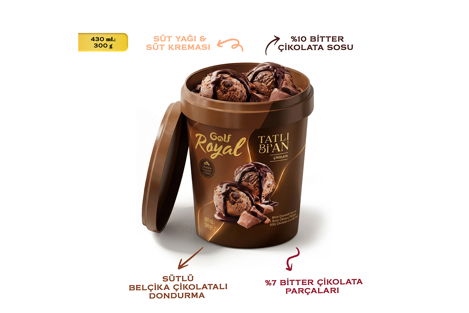 Golf Royal Tatlı Bi’ An Çikolata, 430 mL’lik kaşık kaşık tüketilen kutu formunda; sütlü çikolatalı dondurmayı bitter çikolatalı sos ve bitter çikolata parçalarıyla buluşturuyor.